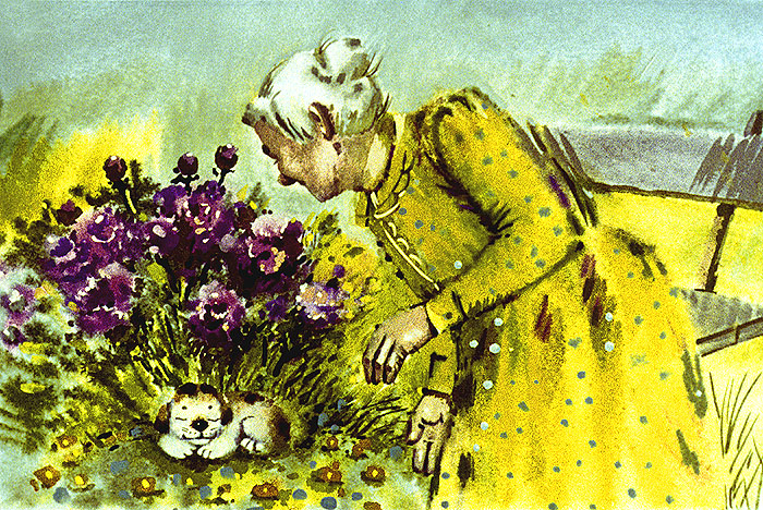Вот и бабушка пришла. И видит, что новый щенок улёгся прямо на её любимые цветы.