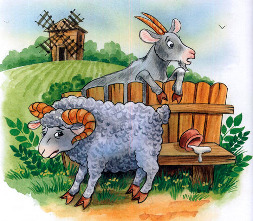 Тут кот-мурлыка вину свою приносил и прощенья просил. Козел да баран его простили и стали втроем думать: как быть и что делать?