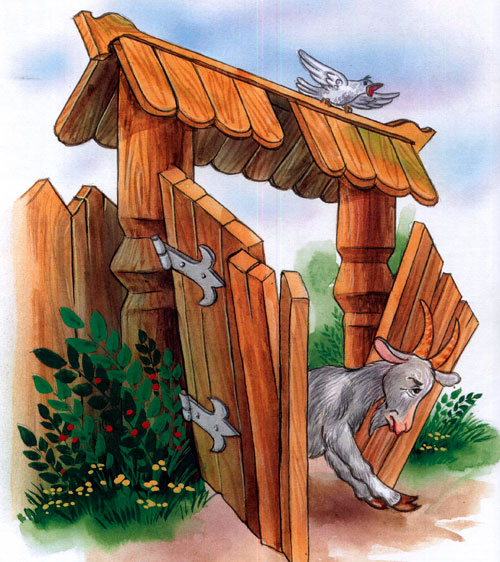 Поднялся козел-козлище, разбежался, ударился — ворота отворились.