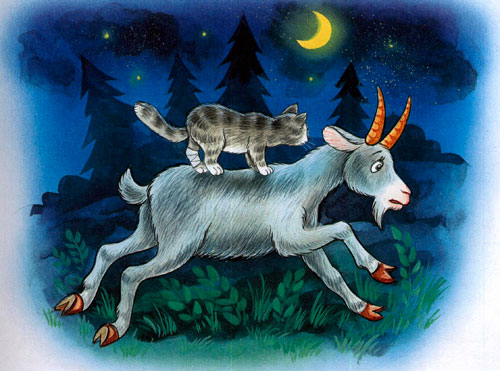 Взял козел кота, посадил его на себя, и поскакали они опять по горам, по долам, по сыпучим пескам.