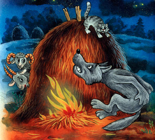 Стали они вчетвером делить темную ночь: медведь под стогом, кот — серый лоб на стогу, а козел с бараном — у костра.