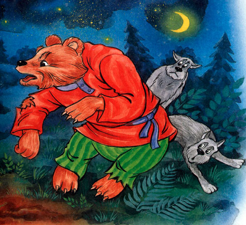 Вот медведь крепился, крепился — да как хватит на каждую лапу по волку! Перепугались они, выдрались кое-как — да, поджав хвосты, давай наутек.
