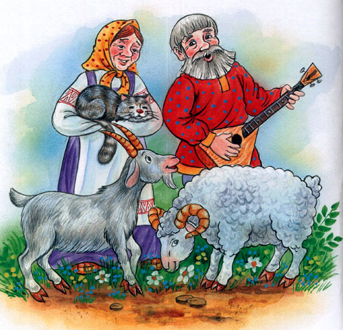 — Как мне не плакать? Баба меня била да приговаривала: «К нам-де придет зять, где будет сметаны взять? Поневоле придется колотить козла да барана!»