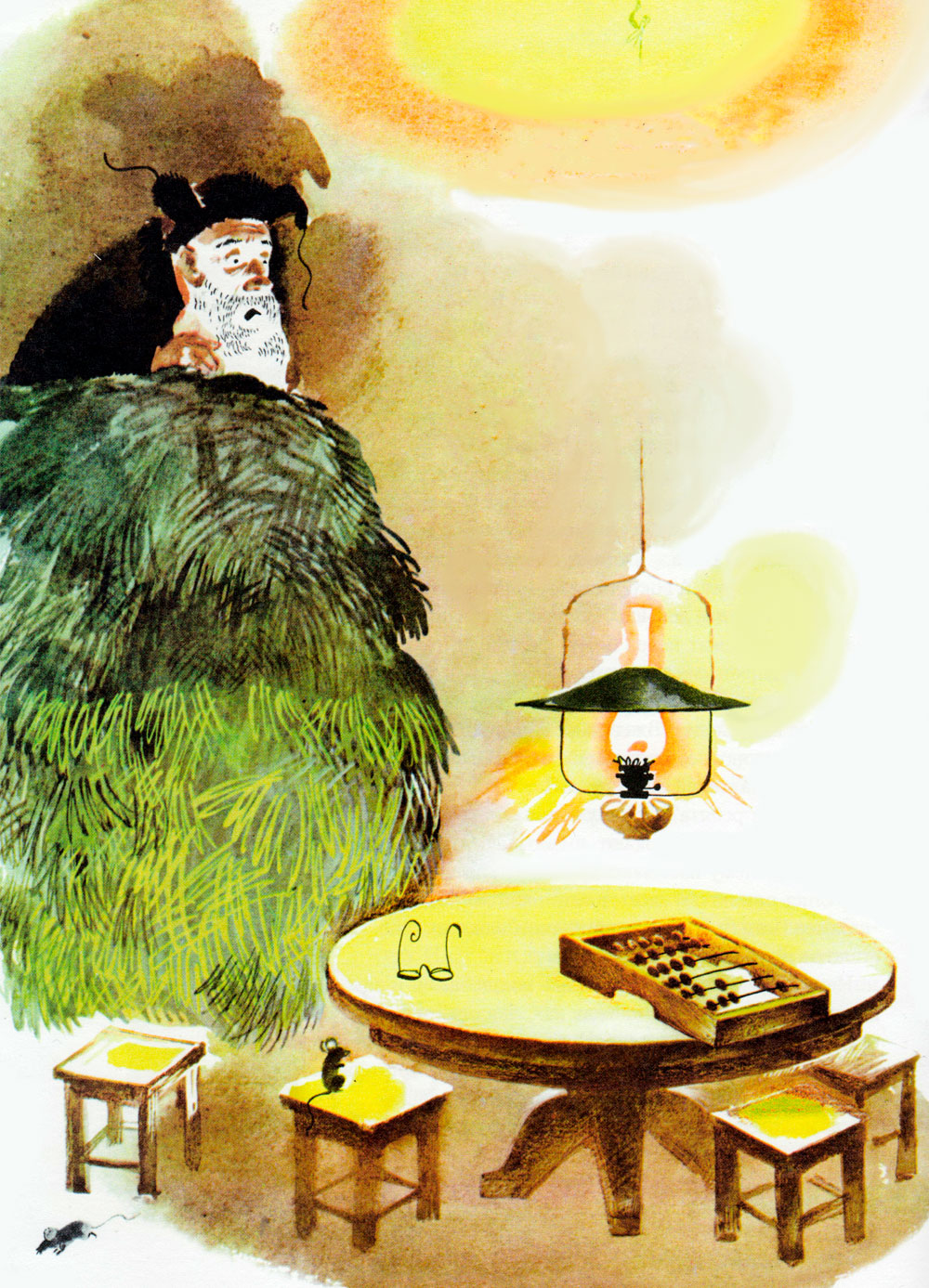 Просыпается Петя — в комнате светло, керосиновая лампа горит под стеклом. А вокруг стола сидят ребята — два мальчика и две девочки. Большие, окованные медью счёты лежат перед ними. Ребята считают и бормочут: